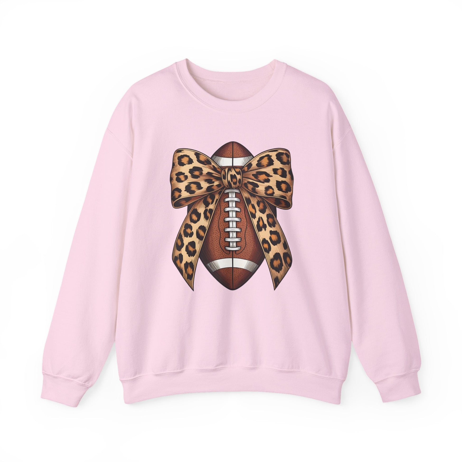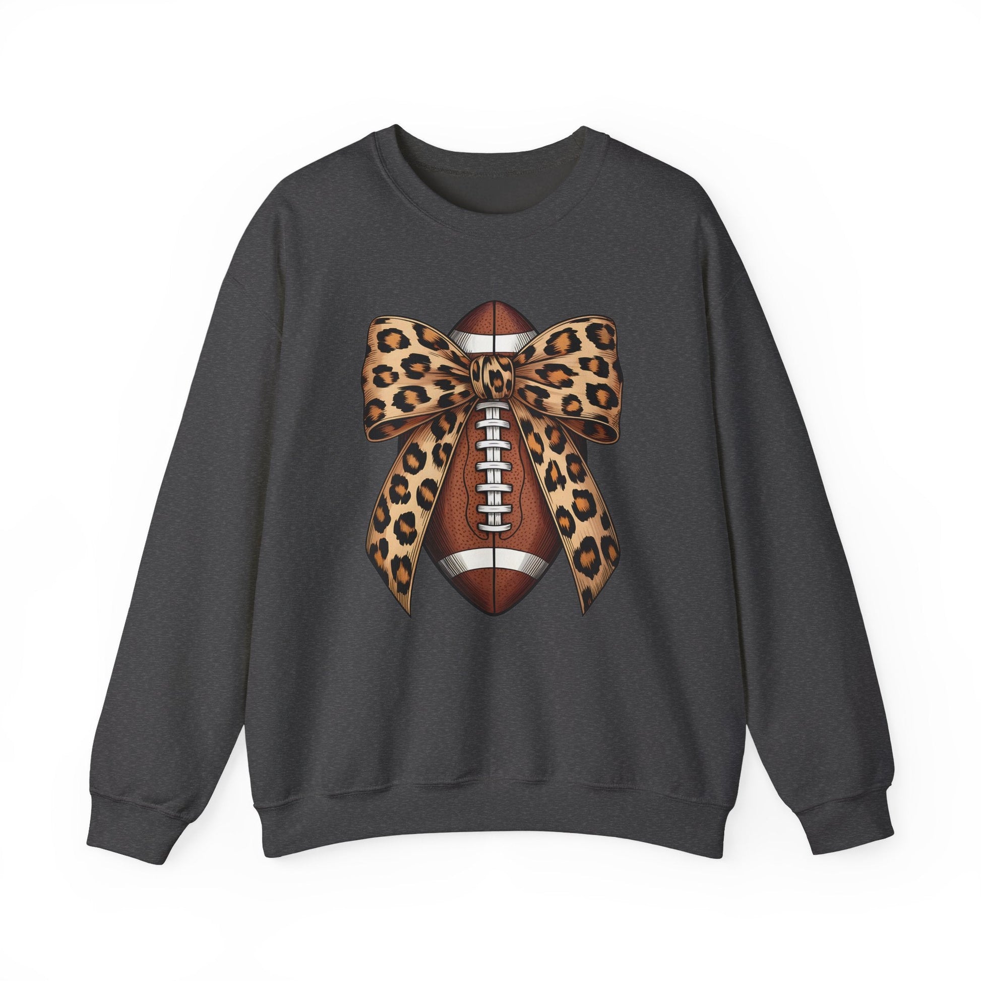 Leopard Bow Football Sweatshirt, perfect for cozy game day apparel and a great gift for sports fans. Embrace the fall fashion vibes with this comfy and stylish sweatshirt. Ideal for adults looking for a comfortable and durable option for game days, holidays, and fall festivities.